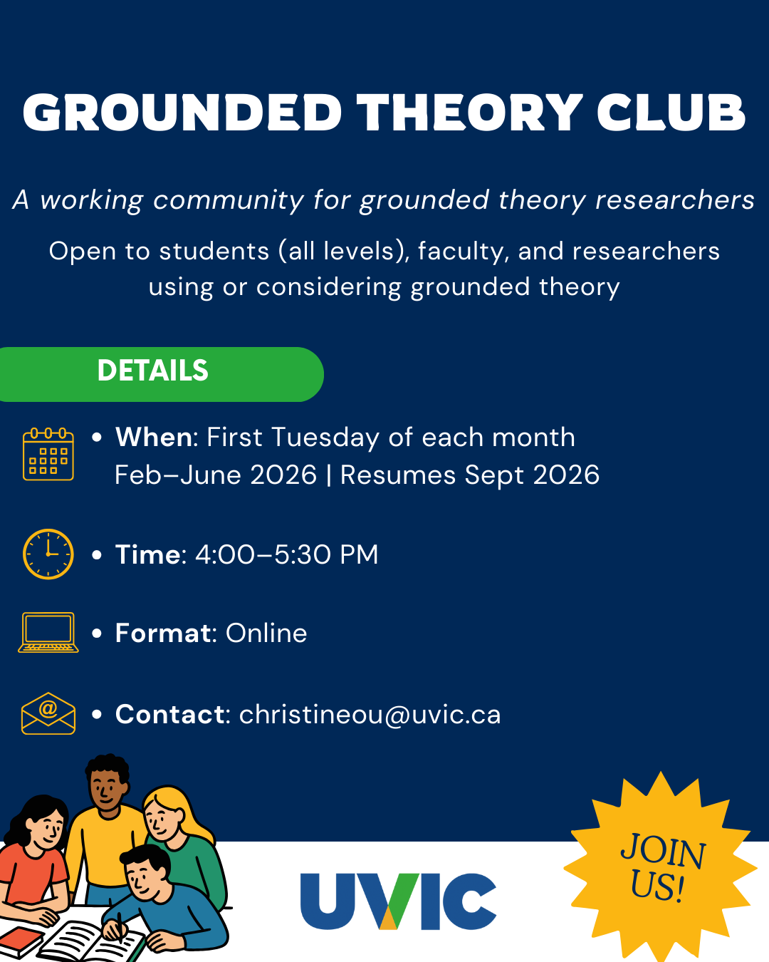 A working community for grounded theory researchers. Open to all students (all levels), faculty, and researchers using or considering grounded theory.